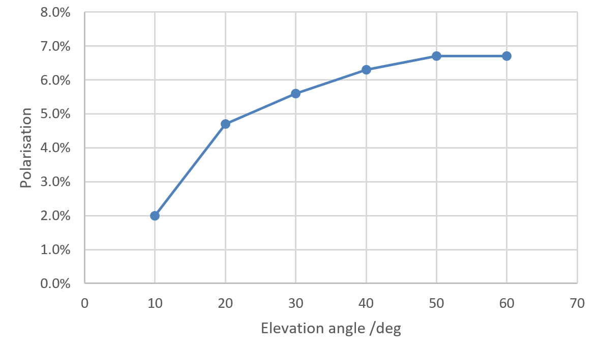 The next two images show an example of the sky signal over Vienna from DNV at a wavelength of 600 nm for different polarizer orientations (left) and dependence of the degree of polarization on the elevation angle (right):
